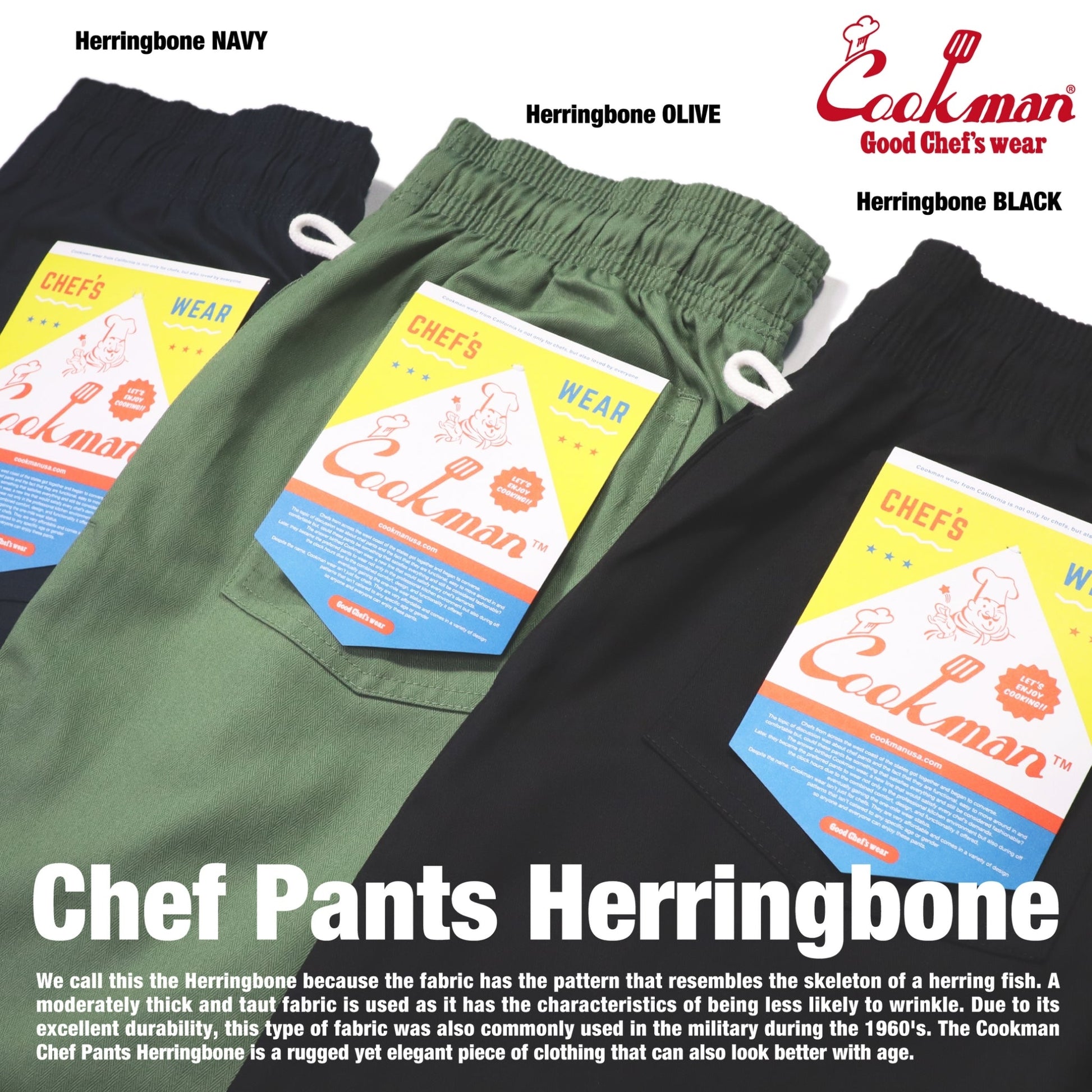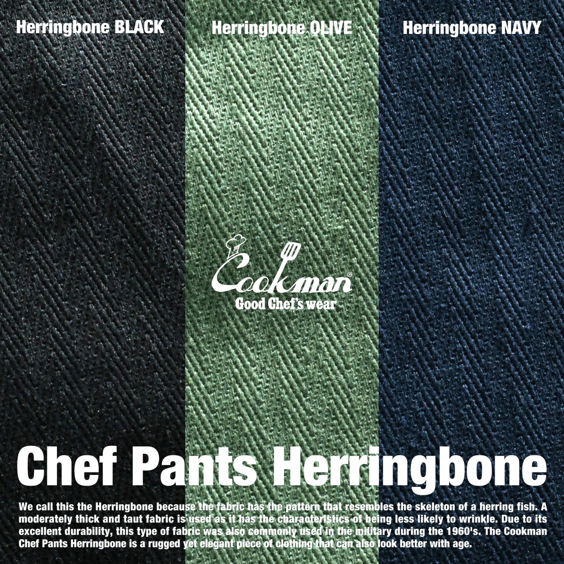 We call this Herringbone because the fabric has the pattern that resembles the skeleton of a herring fish. A moderately thick and taut fabric is used as it has the characteristics of being less likely to wrinkle. Due to its excellent durability, this type of fabric was also commonly used in the military during the 1960's. The Cookman Chef Pants Herringbone is a rugged yet elegant piece of clothing that can also look better with age.